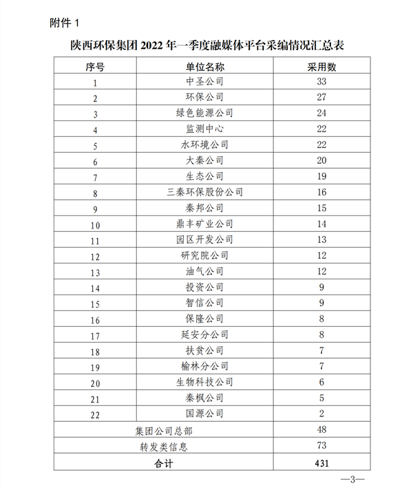 為進一步提高集團融媒體平臺稿件的質量與水平,有效發揮融媒體平臺服務企業高質量發展的作用,傳播時代精神,講好集團故事,按照集團公司《關于建立政務信息采用情況通報和優秀稿件評選制度的通知》(陜環司函〔2021〕31號)文件要求,現將2022年一季度集團公司融媒體平臺稿件采用及優秀稿件評選情況通報如下: