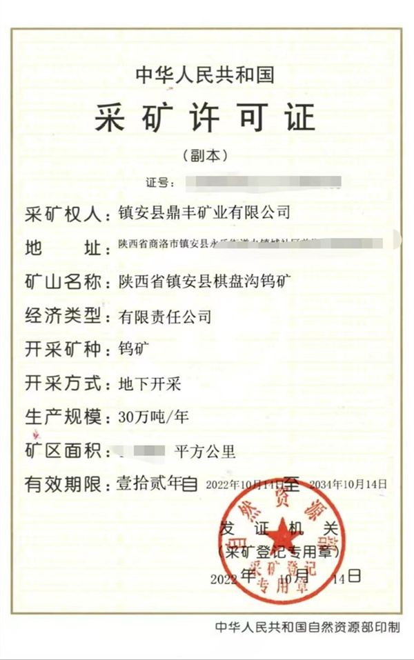 1月11日,鼎豐礦業(yè)公司取得了自然資源部頒發(fā)的鎮(zhèn)安縣棋盤溝鎢礦《采礦許可證》。