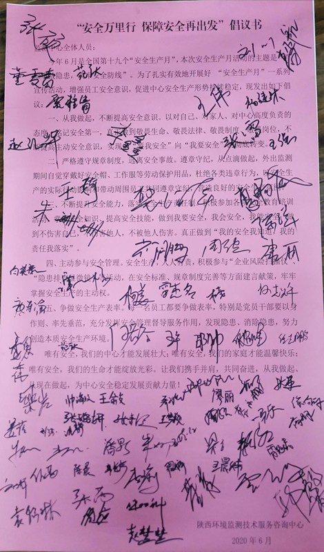 6月9日,監測中心舉行了“安全萬里行,保障安全再出發”倡議活動,向全體職工發起安全倡議,掀起了中心安全我來守護的簽字宣誓熱潮。