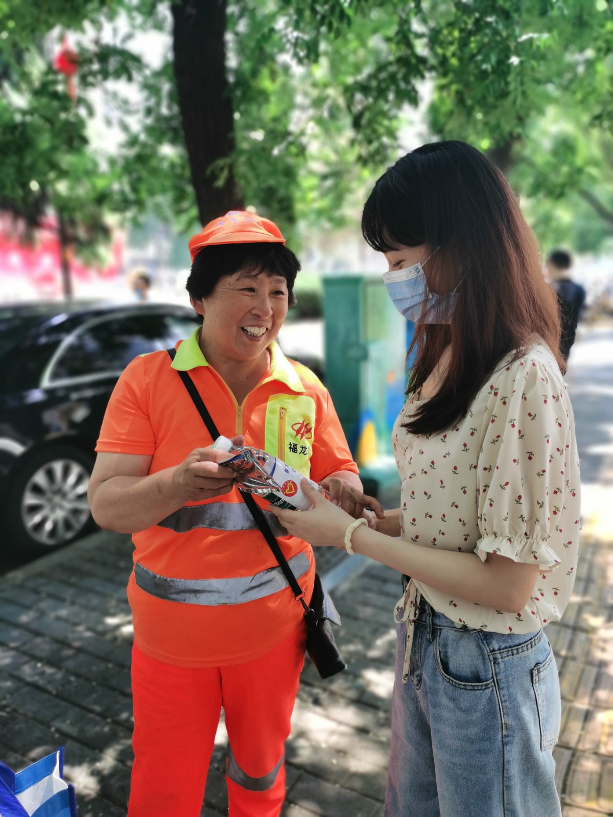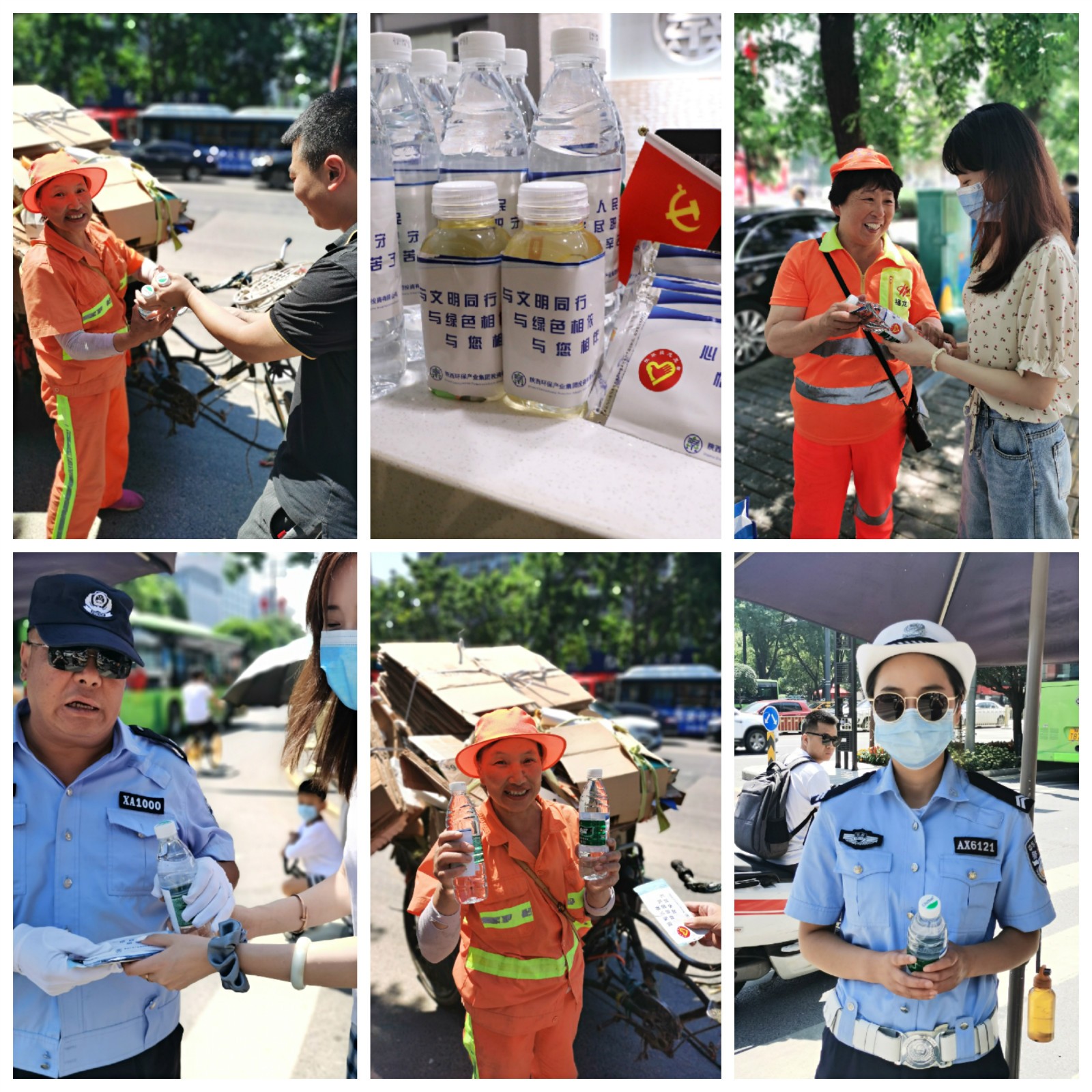 這支由黨員、團員組成的志愿團隊來到西安市北大街十字,為交警、環衛工人等一線工作者送去涼茶、礦泉水、冰涼貼等防暑慰問品,感謝他們對城市發展作出的貢獻。叮囑他們高溫季節,請多注意防暑降溫,并做好疫情安全防護。收到慰問品后,大家再三感謝志愿者的關心,感謝社會對他們的尊重與理解。環衛工人李阿姨說道:“感謝你們對我們的關心,這都是我們的本職工作,不辛苦!我也會注意防暑、注意身體的?!闭沁@樣一些平凡、可敬的社會一線工作者,在平凡的工作崗位上,做著不平凡的工作,才有我們美好的城市生活環境。
